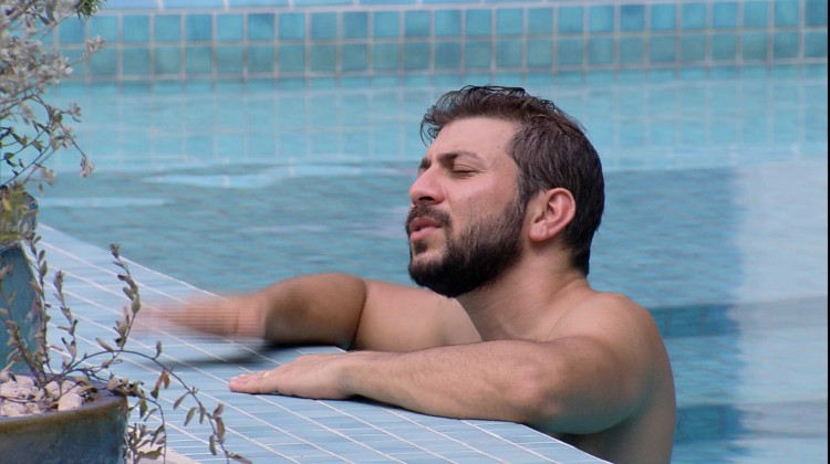 Caio é o único participante acordado no BBB21. O brother está aproveitando o tempo para curtir uma piscina. Sozinho, o fazendeiro pega sol e canta na área externa.