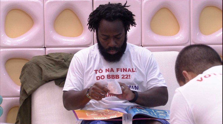 Os três finalistas do BBB 22 receberam álbuns de figurinhas personalizados com fotos de momentos que viveram ao longo da edição. Enquanto colam os adesivos na revista, eles relembram os primeiros brothers que cumprimentaram ao entrarem na casa e lembram, também, de Pedro Scooby.