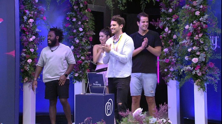 Lucas, Eslovênia, Gustavo e Douglas Silva chegam ao Almoço do Anjo no BBB 22. Recebidos com uma chuva de pétalas de rosas, o Líder lê uma cara.