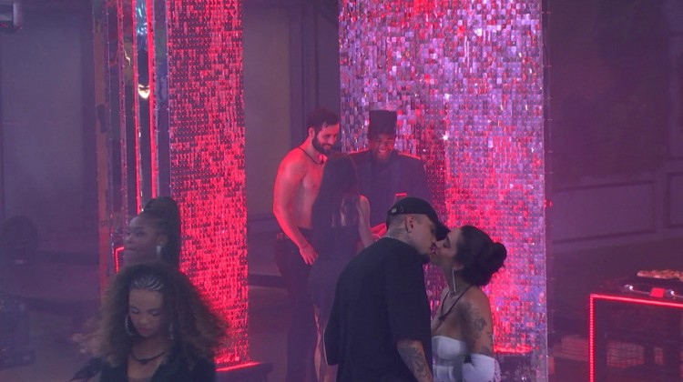 Na pista de dança da festa na casa mais vigiada do Brasil, o funkeiro e a nutricionista trocam beijos, enquanto toca "CUFF IT", de Beyoncé.