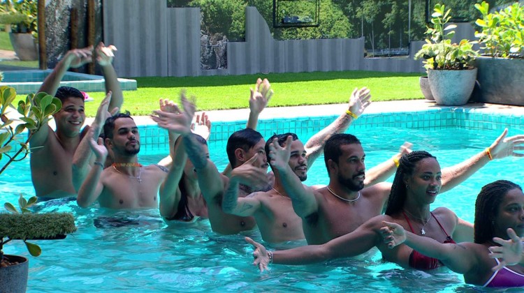 Quem dá o passo a passo da coreografia é a bailarina cearense, Renata. A sister orienta as posições e os movimentos dos confinados na piscina, enquanto os brothers seguem o ensaio, animados.