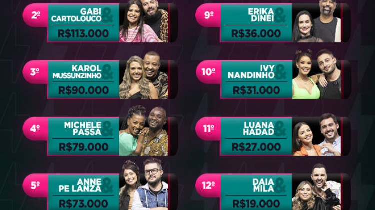 Confira quanto os casais do Power Couple acumularam de dinheiro na segunda semana